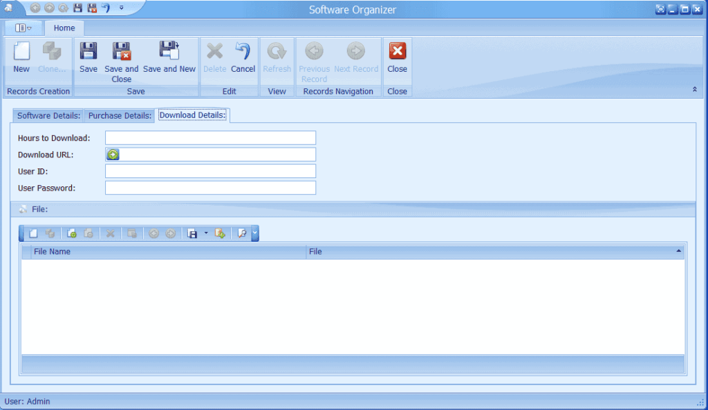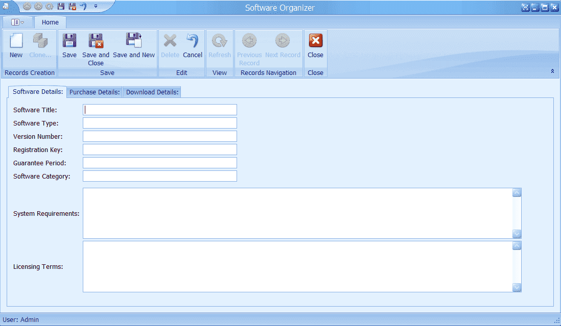 This window is where you enter all your software details. You can track title, type, version number, registration key, guarantee period, software category. Also enter any system requirements or licensing terms.