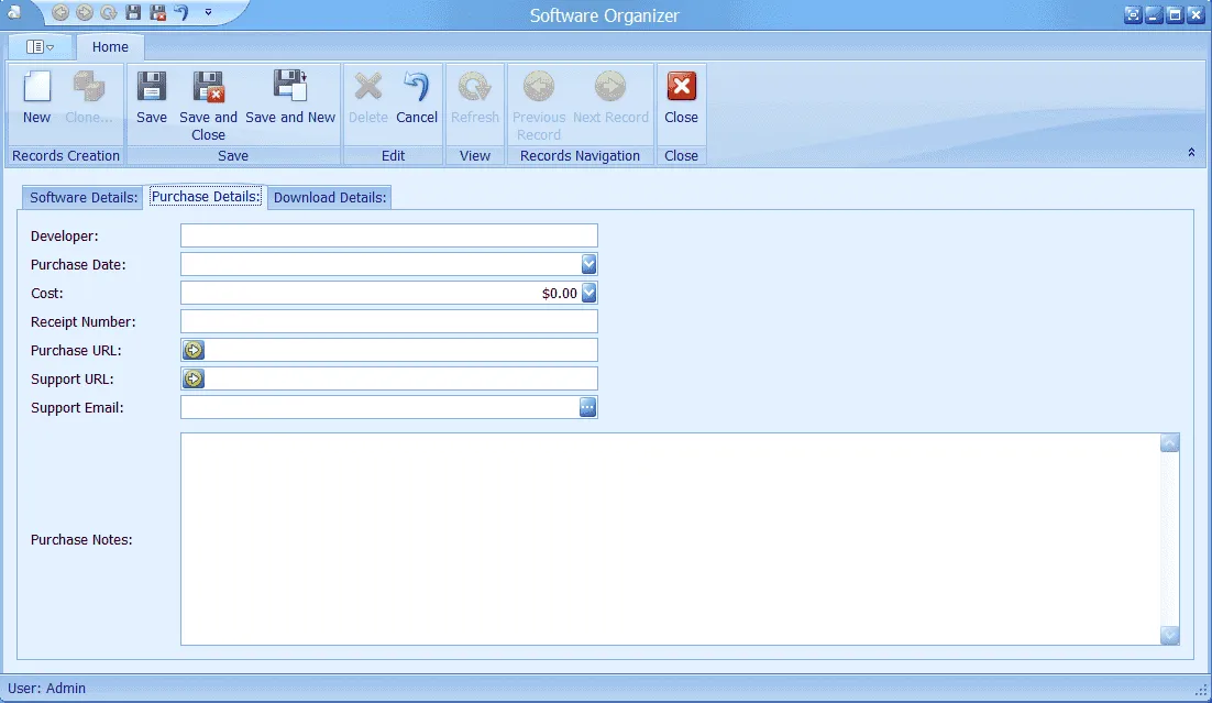 This window is where you enter all your software purchase details. You can track title, type, version number, registration key, guarantee period, software category. Also enter any system requirements or licensing terms. Software Organizer