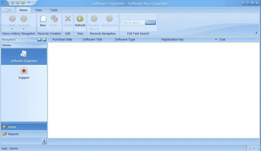 This is the main Software Key Organizer window. Here you can select ‘New’ from the menu bar to enter a new software purchase. Or click Support to enter our support site.